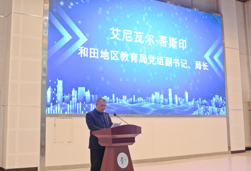 和田地区教育局党组副书记、局长艾尼瓦尔·吾斯印讲话。他表示,今天,我们在和田职业技术学院成立和田地区昆冈经济技术开发区市域产教联合体,要坚持以“园区主导、多元共建、资源共享、责任共担、合作共赢”为指导思想,通过援疆省市教育资源与经验的支持,着重助力和田打造一套扎实、有实效、有持续生长力的职业教育体系。从强化专业“适配”、拉动师资“造血”、协同硬件“升级”、助推产教融合,让职业教育改革“一体、两翼、五重点”在和田落地生根。