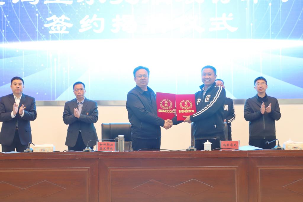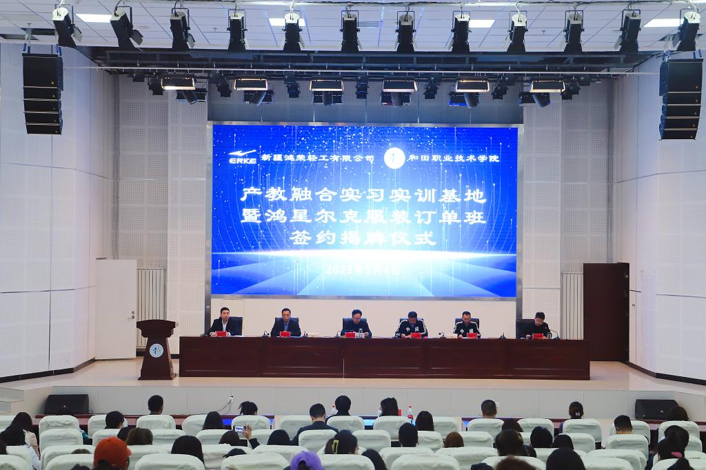 为贯彻落实全国职业教育大会精神,推动产教融合、校企合作,2023年3月4日,我院举行产教融合实习实训基地暨鸿星尔克服装订单班签约揭牌仪式,与鸿星尔克--新疆鸿荣轻工有限公司签订了校企合作协议并揭牌成立了“鸿星尔克服装订单班”。出席签约揭牌仪式的有和田地委教育工委副书记、学院党委书记王志文,地区教育局党组成员、副局长陈则立,鸿星尔克-新疆鸿荣轻工有限公司总监孙锐、副总监黄奉祥、人事科科长郑燕欣、采购科科长洪跃勤,我院党委副书记、院长杨理连,签约仪式由学院党委委员、副院长何晓辉主持。