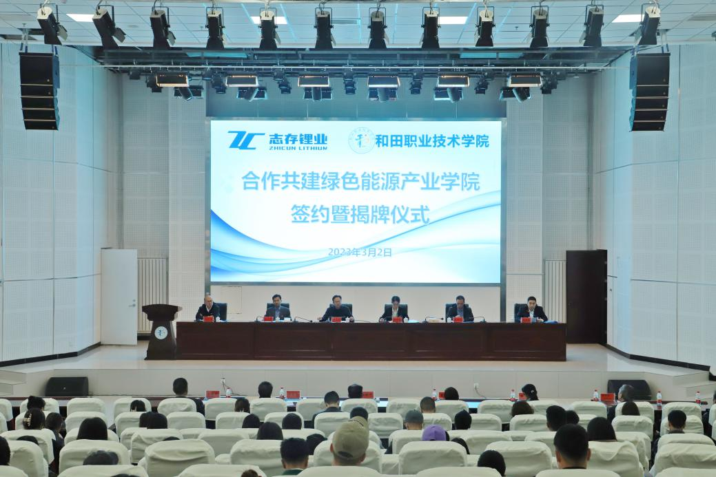 为进一步贯彻落实党的二十大及二十届一中、二中全会精神和国家关于职业教育发展相关文件精神,在地委、行署的坚强领导下,行业企业的大力支持下,3月2日,我院与洛浦志存新能源材料有限公司合作共建绿色能源产业学院签约暨揭牌仪式在报告厅举行。地区工业和信息化局党组书记庞永明,地区教育局党组成员、副局长陈则立,地区工业和信息化局党组成员、副局长何亮舟,志存锂业集团新疆基地副总经理张洋艳,洛浦志存公司总经理孙仁胜,和田地委教育工委副书记、学院党委书记王志文,学院党委班子成员、全体中层干部和教师代表、学生代表共百余人参加本次仪式。