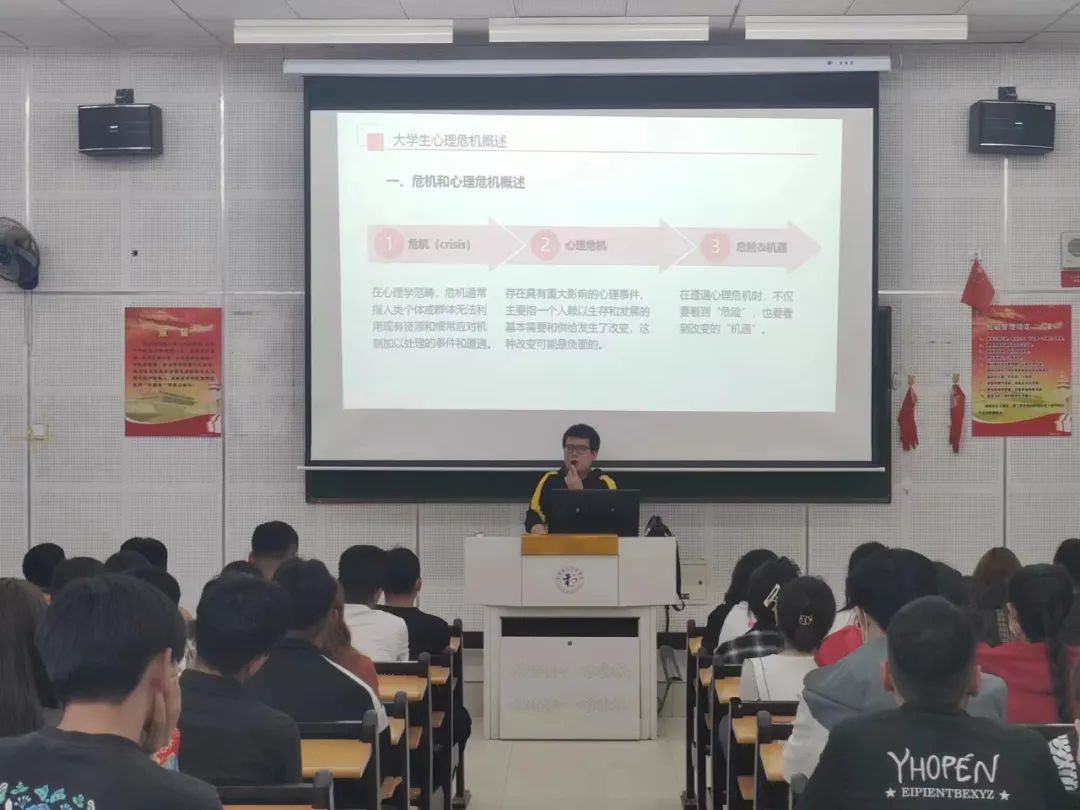 讲座主要围绕心理危机的概述、产生心理危机的应激源因素和个体易感性因素三方面内容展开。通过讲座让同学们对大学生心理危机的预防与干预有了基础认知,了解了心理危机的产生机制,同时,也让同学们懂得用培养积极认知、建立良好的应对方式、构建社会支持系统等方式预防心理危机,普及心理危机应急措施。