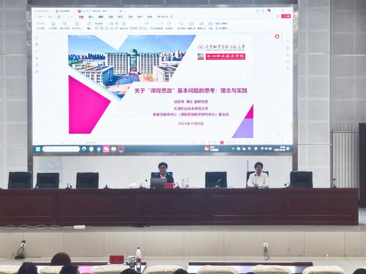 为贯彻落实党的二十届三中全会精神及全国教育大会精神,全面落实立德树人根本任务,推动课程思政与专业课程同向同行,提升教师课程思政教学能力,10月9日下午,学院邀请天津职业技术师范大学第九批新疆支教团领队、天津职业技术师范大学体美劳教育中心(课程思政教学研究中心)副主任徐宏伟博士为全体教师作题为“关于‘课程思政’基本问题的思考:理念与实践”的专题讲座。学院党委副书记、院长李宏出席会议,会议由教务处主任于祯妮主持。