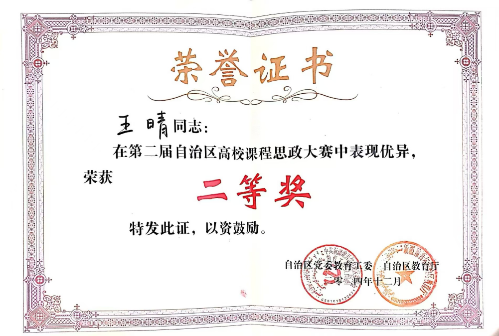 12月14-16日,由自治区党委教育工委、自治区教育厅联合主办的第二届自治区课程思政大赛在新疆工程学院顺利举行。全区共有41位选手进入决赛,我院工艺美术系教师王晴凭借新颖的教学设计与精彩的课堂呈现,在激烈的竞争中脱颖而出,荣获二等奖。