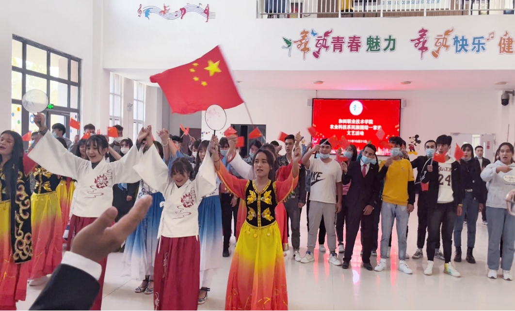 欢快的舞蹈跳起来,动听的歌儿唱起来。晚会在喜庆欢快、富有强烈民族自豪感的歌舞《爱我中华》中拉开了帷幕。歌曲《民族团结一家亲》唱出了大家的共同心愿,男声独唱《花儿为什么这样红》以激昂的歌声演绎出歌曲中鲜花象征着共产党员身上的爱国、忠诚、为民和大无畏的精神。游戏环节使得演出现场的气氛热烈异常,能歌善舞的同学们以一曲《新疆吆喝》邀请在坐的老师们进场一同跳舞,将整场晚会氛围带入高潮。联谊会的最后,一曲欢快的《和谐新疆》点燃了全场每一个人的热情,全体教师与同学们一起舞蹈,会场成了一片欢乐、团结的海洋。伴随歌曲《难忘今宵》娓娓道来,整个联欢会在和谐、温馨、欢乐的气氛中圆满结束。本次联欢会主题鲜明、基调昂扬,增进了各族师生的情谊,极大的鼓舞了农科系的全体师生。